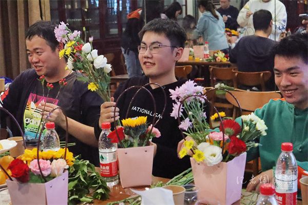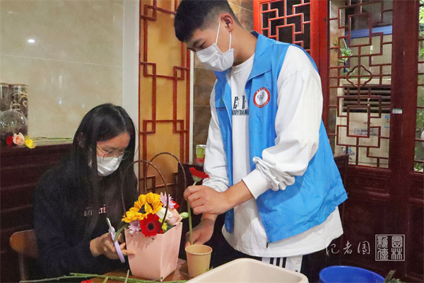 随后,大家在张瑜服务队的志愿者的帮助下进行花艺体验。张瑜服务队队员王湛宇讲解了本次插花所用的花材和插花的流程步骤。他说:“向日葵、月季这一类的花材作为主花使用,起到撑起整个画面的骨架的作用,康乃馨、非洲菊等花材让整个作品丰富充实,小菊等花材填补空隙,最后用叶材点缀衬托。”在他的引导下,大家纷纷动手,完成了属于自己的插花作品。