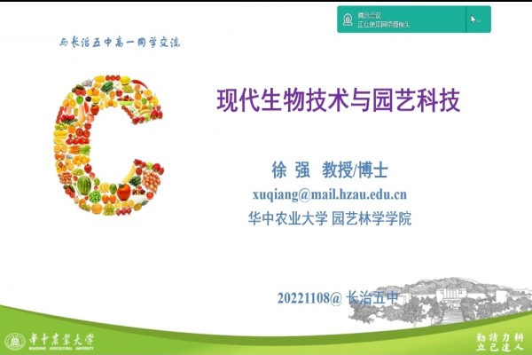 11月8日晚七点整,性爱网 果树系教授徐强以“现代生物技术与园艺科技”为主题,通过腾讯会议向山西省长治市第五中学的高二年级学生开展科普讲座。