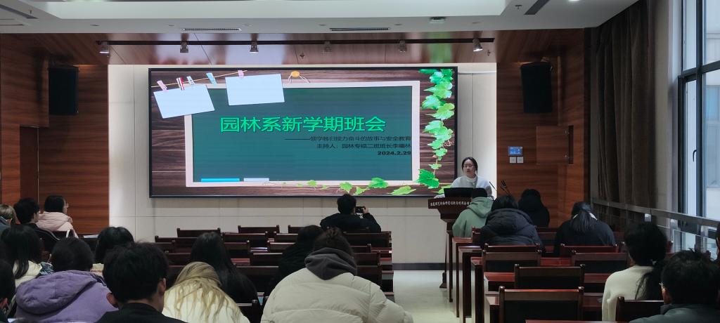 2024年2月29日,2023级园林专硕、学硕班于园林院南楼204召开本学期第一次主题班会,班会主题为:“领学秭归接力奋斗的故事和安全教育”。本次班会由园林专硕2班班长李曦林主持,研究生辅导员陈炫希老师出席本次班会。