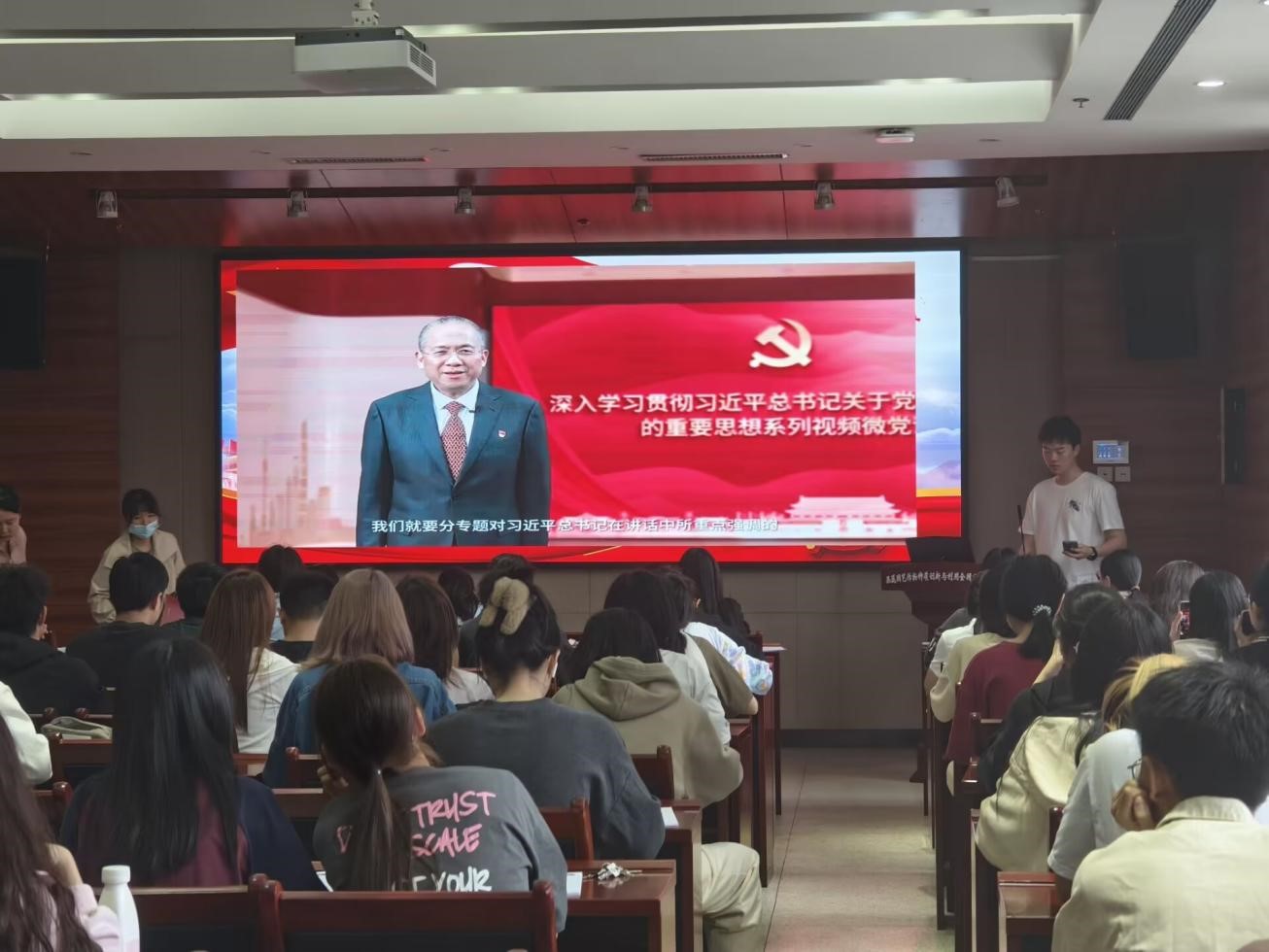 在集体观影环节中,学生们全神贯注地观看了“关于深入贯彻习近平总书记关于党的自我革命的重要思想”系列教育视频,通过生动的图像和清晰的解说,深化了对习近平新时代中国特色社会主义思想的理解。