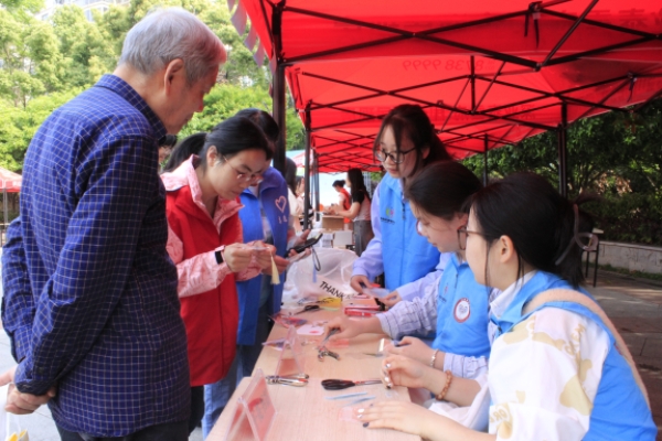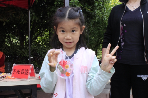 活动伊始,张瑜服务队的志愿者们在摊位边热情地为路过的居民介绍活动内容。志愿者阮梦薇为驻足停留的老奶奶解释赏春、惜春的活动主题,并积极的讲解、示范花签的制作方法。奶奶连连称赞,在志愿者的引导和协助下开始了书签的制作。时间流逝春意渐浓,路过的居民们纷纷被新奇的活动形式吸引驻足,簇拥在摊位前。志愿者们分散指导居民,鼓励居民自己动手制作,创造属于他们自己的独一无二的春日书签。一位小女孩拿着做好的花签,蹦蹦跳跳到母亲身边,骄傲的举起展示,撅着嘴喊道:”妈妈你看我做的好不好!“母亲微笑着点头。母女二人的脸上都露出了幸福的笑容。