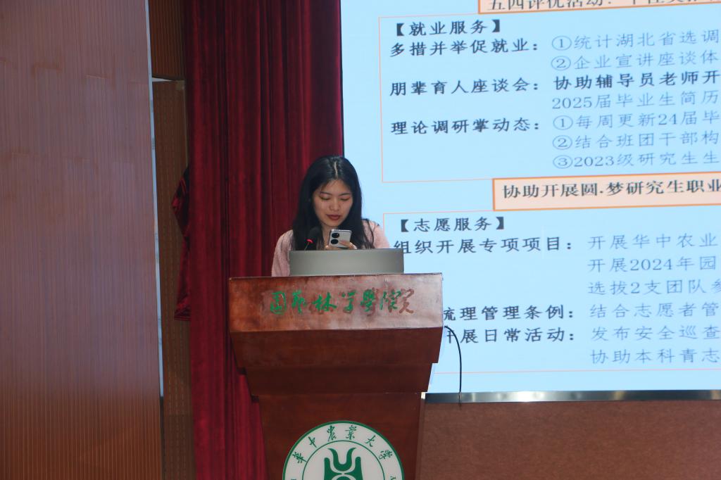 会议开始,由各学生组织负责人对这学期的工作进展及未来展望进行汇报。党建办负责人常家容从“周四理论学习、入党积极发展、发展对象推拟、预备党员培训、毕业生党员档案核查”五方面对近阶段工作进行了总结。团工委副书记王上从“团务工作、就业服务、志愿服务”等方面总结了近期工作内容。科协主席黄婧婷详细阐述了近期科协举办了学术活动的内容,并希望在未来为大家提供更多更好的活动。陈伊姗就“压花活动、安全检查”等方面对秘书处、生保部的工作进行了总结。新宣负责人孙嘉晗在总结了近期工作的基础上,希望各部门能够集思广益,多多协作,提供更好的宣传想法。创新创业部负责人胡琦从“院内基础工作、校就创对接工作”两方面进行述职。文体部负责人李祎涵指出近期文体部的工作重心在“园林好声音、狮子山杯足球赛、园林欢乐汇”等活动的举办上。