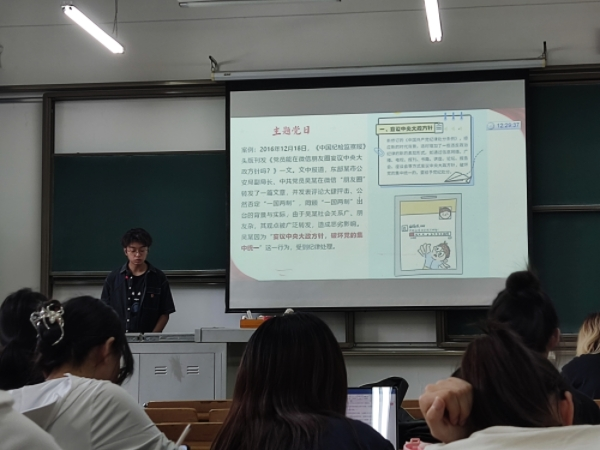 会议上黄瑞杰同志组织大家学习了《中国共产党纪律处分条例》第二编分则部分内容、《中国共产党党员网络行为规定》及习总书记对学校思政课建设作出的重要指示精神。他强调了党的政治纪律与廉洁纪律的重要性,并用视频向在场党员解读新修订的《中国共产党纪律处分条例》。
