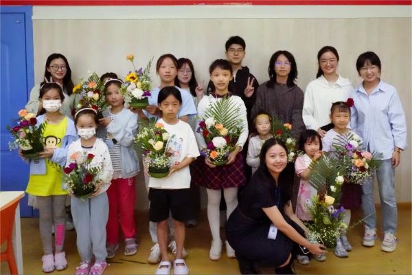 在帮助孩子们完成插花的同时,队员们巧妙地将一些花卉科学知识融入到与孩子的交流中,激发他们对花卉的进一步探索。创意插花的活动,不仅能够培养孩子们独立思考和创新思维的能力,更能让孩子们在愉快友好的氛围中感受创造的乐趣与实践的喜悦。活动过程中实践队队员们也与孩子们建立起深厚的友谊,不仅积极做好科学知识的传递者,更成为孩子们成长道路上探索更多面的陪伴者,利用自己的专业知识为孩子们打开了一扇通往新世界的大门。